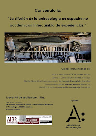 El próximo jueves 8 de septiembre Grupo de Estudios Antropológicos La Corrala participará en el II Congreso Internacional de Antropología AIBR, en el conversatorio "La difusión de la antropología en espacios no académicos", un intercambio de experiencias organizado por la Associació Antropologies que tendrá lugar en la sala Gran de la Facultat de Geografia i Història de Barcelona (c/ Montealegre 6, 08001), a partir de las 17:00 horas.