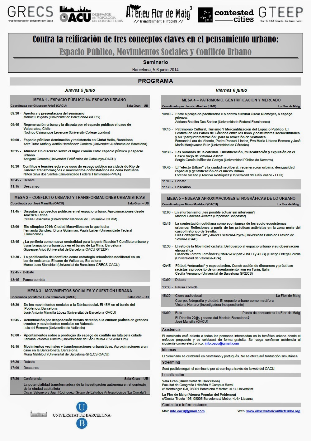 El próximo jueves 5 de junio de 2014, a partir de las 17:30 h., estaremos en Facultat de Geografia i Història de la Universitat de Barcelona, en el Seminario Contra la reificación de tres conceptos clave en el pensamiento urbano: Espacio público, movimientos sociales y conflicto urbano, organizado por el Observatori d'Antropologia del Conflicte Urbà y la red Contested Cities